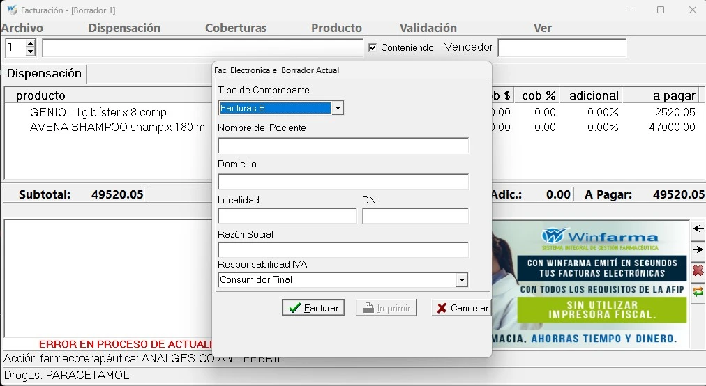 La facturación es el punto crítico de la farmacia. Un error aquí significa multas. WinFarma es un sistema de gestión homologado que automatiza la emisión de comprobantes fiscales, adaptado 100% a los nuevos requerimientos de la Agencia de Recaudación y Control Aduanero (ARCA).